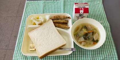 <牛乳 食パン わかさぎフライ スープ カリフラワーとコーンのサラダ バター>