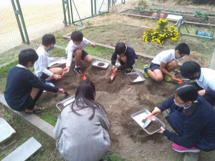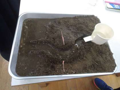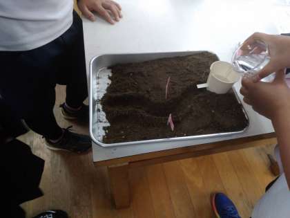 トレイに土をのせて、溝を作って川のモデルを作りました。