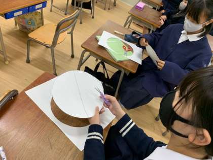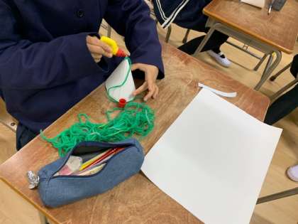 手芸クラブは、型紙に毛糸を巻いて、クリスマスツリーを作っています。