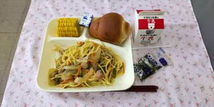 <牛乳 1/2パン ウインナーときのこの和風スパゲッティ 焼きとうもろこし 固形チーズ>