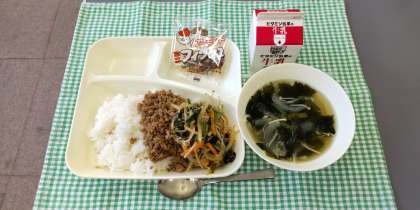 <牛乳 ビビンバ わかめスープ アーモンドフィッシュ>