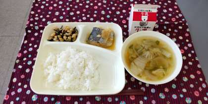 <牛乳 ごはん さごしのおろしじょうゆかけ さといものすまし汁 大豆の煮もの>