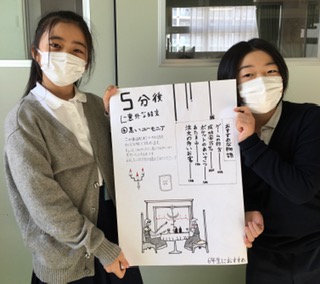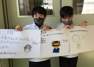 読書週間の後半にお昼の放送で発表したクイズと本の紹介です。左から4年、5年、6年の写真です。