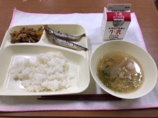 <牛乳 ごはん 焼きししゃも 五目汁 きんぴらごぼう>