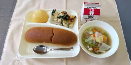 <牛乳 黒糖パン スープ煮 ほうれんそうのグラタン 白桃(缶)>