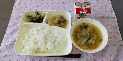 <牛乳 ごはん さばのみぞれかけ すまし汁 こまつなの煮びたし>