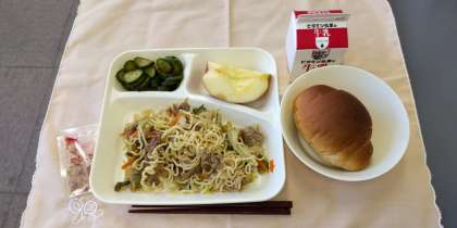 <牛乳 1/2パン 和風焼きそば きゅうりのしょうがづけ りんご>