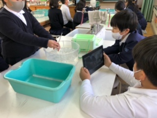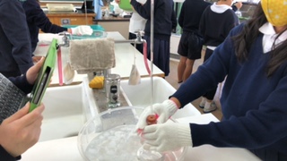 氷水の中に、ゼリーを入れた丸底フラスコをつけておくと、ゼリーは下に落ちました。