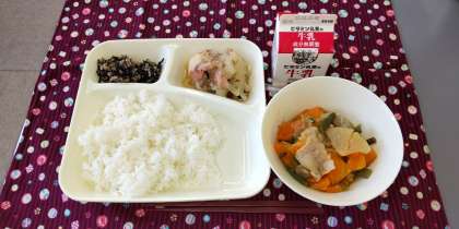 <牛乳 鶏肉のゆず塩焼き 含め煮 魚ひじきそぼろ>