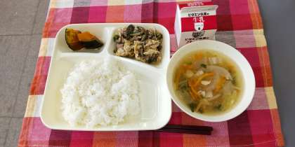 <牛乳 ごはん 豚肉と干しずいきのみそ煮 うすくず汁 焼きかぼちゃの甘みつかけ>