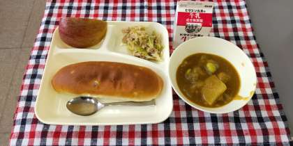<牛乳 おさつパン ミートボールと野菜のカレー煮 ツナとキャベツのソテー りんご>