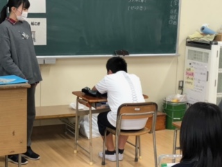 背骨のプリントをしたシャツを着て、悪い姿勢をしてみると、骨がゆがんでいる様子がわかりました。
