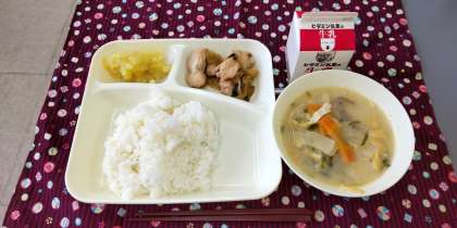 <牛乳 ごはん 鶏肉の甘辛焼き かす汁 くりきんとん>