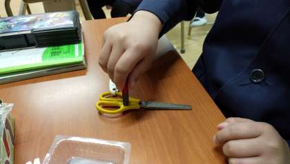 そこで、もう一度詳しく調べることになり、はさみのプラスチックの部分で中に鉄が入っているところは、じしゃくにひきつけられることがわかりました。