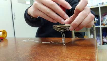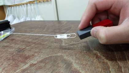 また、写真のように、離れていてもゼムクリップはじしゃくにひきつけられて浮いていたり、間に段ボールが挟まっていてもゼムクリップをひきつけたりすることがわかりました。