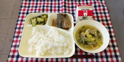 <牛乳 ごはん さばのみそ煮 五目汁 ブロッコリーのごまあえ>