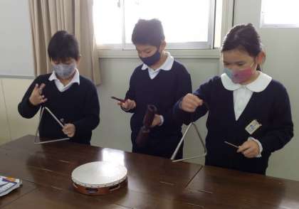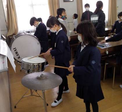その1時間目として、音楽室で様々な楽器を鳴らして音の高さや響き方、手に伝わる振動などを調べました。