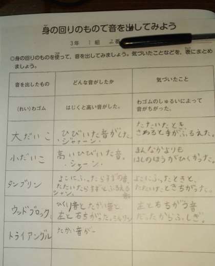 音色のちがいだけでなく、たたく強さで音が変わったり、たたくバチのちがいで響きが変わったりすることなど、たくさんのことに気づくことができました。