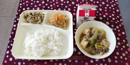 <牛乳 ごはん すき焼き煮 もやしとにんじんの甘酢あえ ツナっ葉いため>