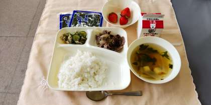 <牛乳 手巻きご飯(牛肉の甘辛煮、ツナソテー) すまし汁 いちご>