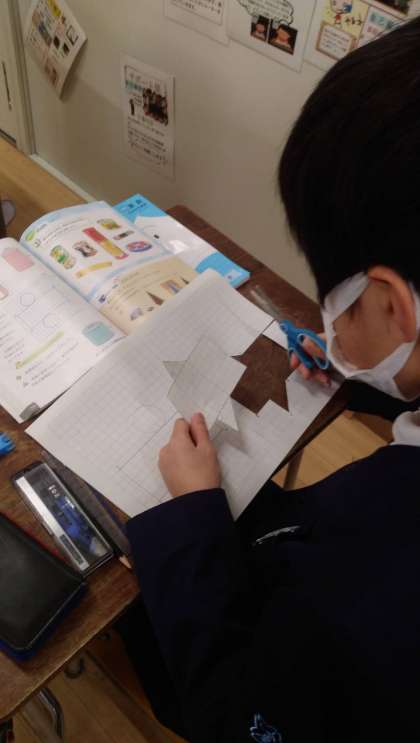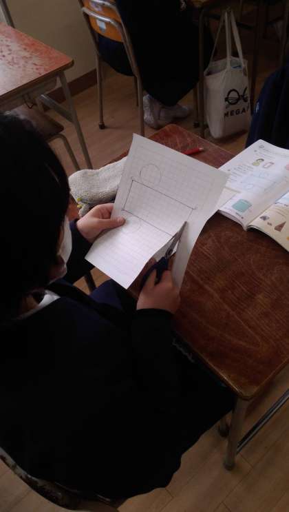 展開図をかいたら、外側をはさみで切って、角柱や円柱になるか組み立てます。