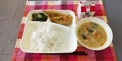 <牛乳 ごはん いわしフライ みそ汁 きゅうりの赤じそあえ>