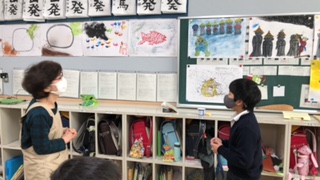 図画工作科で描いた作品を図書館補助員の先生に紹介しました。