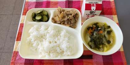 <牛乳 ごはん 豚肉のコチジャンいため 鶏肉とはるさめのスープ きゅうりのナムル風>
