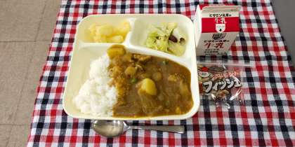 <牛乳 チキンカレーライス ビーンズサラダ アーモンドフィッシュ パイナップル(缶)>