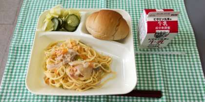 <牛乳 1/2黒糖パン さけのクリームスパゲッティ キャベツときゅうりのサラダ>