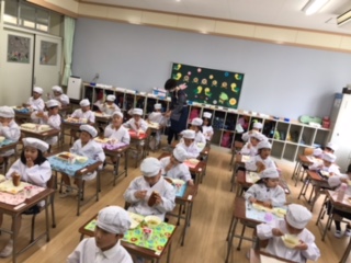 食べ終わった後、「パンがおいしかった!」「グラタン大好き!」「みかんがあまくておいしかったよ」と、たくさん感想を話ししてくれました。