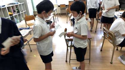 自分の名前をローマ字で書いた名刺を交換していくゲーム。