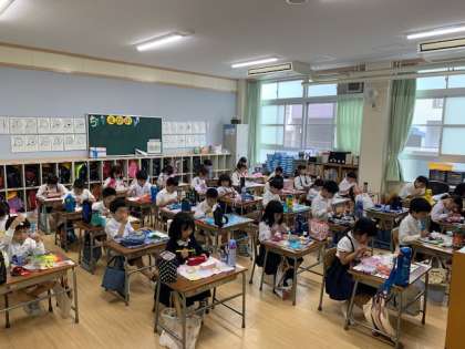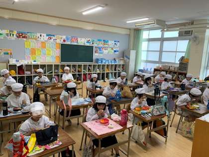 きっと、友だちと「たこさんウインナー入ってる!」「おにぎりがお顔になってる!」などわいわいお話ししながら食べたかったと思いますが、いつも通り黙食を頑張りました。
