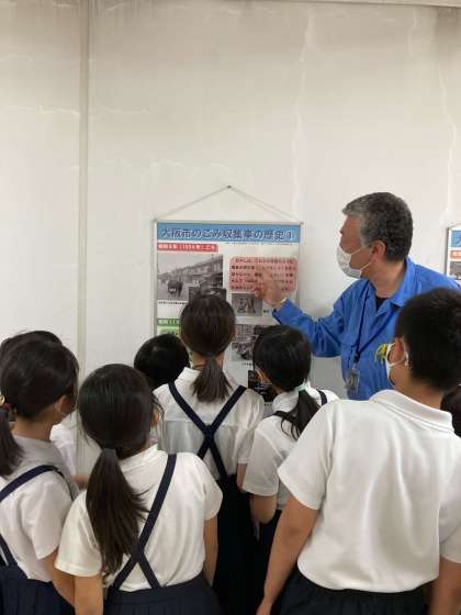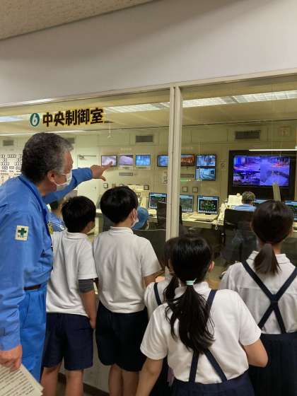 一人ずつ階段に上って焼却工場の煙突を見せてもらい、煙突の大きさにびっくりしていました。