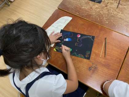 真っ黒の中から、ひっかいていくと浮かび上がる「ふしぎなせかい」を描きました。