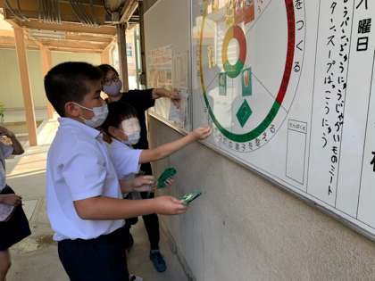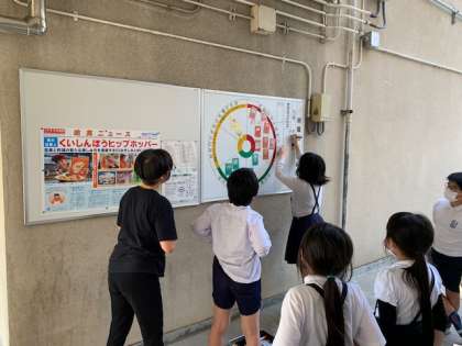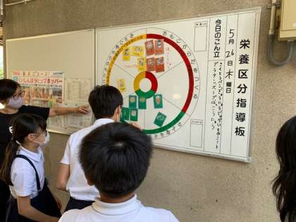 毎日、給食室前の栄養掲示板に献立を書き、材料の栄養区分を知らせています。