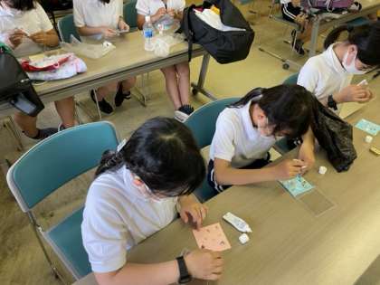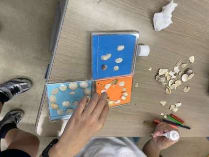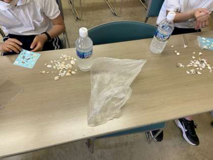 さっき海岸で集めた貝がらで、思い出の作品を作っています。