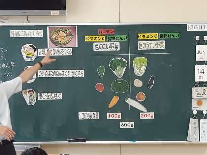給食に出てくる馴染み深い野菜をビンゴで出した後、野菜の働きについて学習しました。