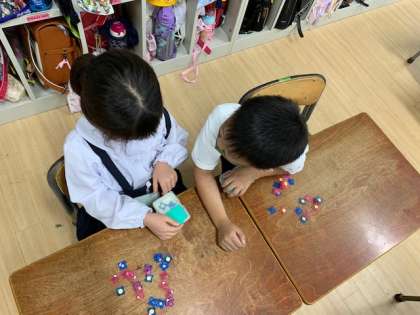 おはじきを使って、「いくつといくつゲーム」をしました。おはじきケースの半分をふたで隠すことができます。