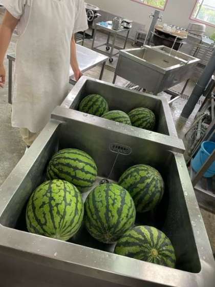 丸いスイカを64等分に切って甘い部分に偏り出ないように工夫しています。