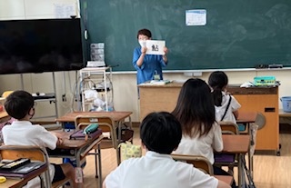 5年生の教室では、書画カメラを使って、絵本の絵を大きく映し出して見せてくださいました。今日の読み聞かせに使った本はしばらく教室に置いていますが、リアルタイムで大型テレビに映る絵を見ながら聞くのは、より楽しめるかもしれません。