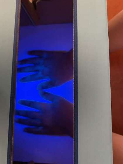 その後、ブラックライトを当てると洗い残した部分が光ります。