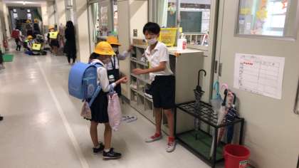 児童会のメンバーがむかえる中、