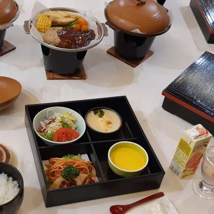 今晩の献立です。 熱々のハンバーグにみんなにっこり!