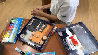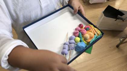 しっかりと丸めてのばした粘土を細かくちぎって、竹くしで模様をつけ、作品づくりを楽しみました。