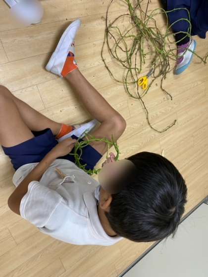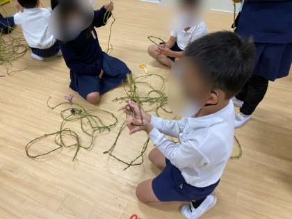先日の芋掘りのときにとったサツマイモのツルでリースの土台作りをしました。
