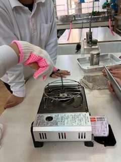 実験用のガスコンロを使って、金属の球を熱し(上の写真)、金属の輪を通るか実験しました。熱する前は輪を通ったので、熱することによって金属の球の体積が大きくなり、輪を通らないのだとわかりました。(下の写真)