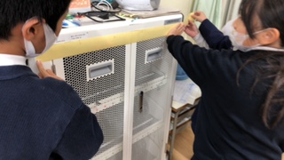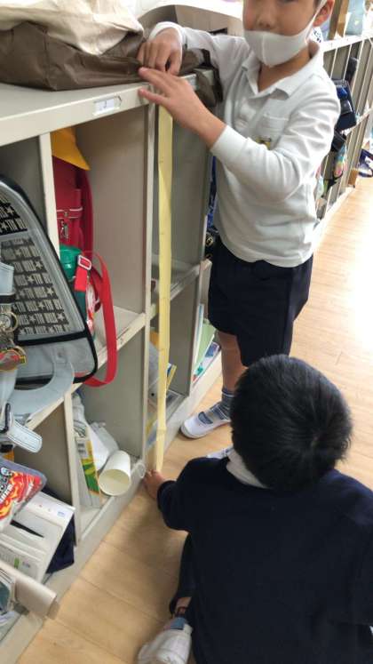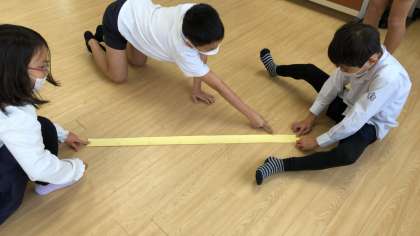 多目的室で木目の床にそって、1mのテープに印をつけていき、1つ分が1/7mの分数ものさしを作りました。