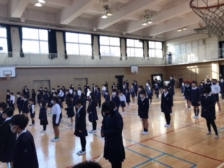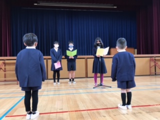 転入生の紹介のあと、校長先生からのお話です。そして、6年生と2年生の代表から「3学期にがんばりたいこと」を聞きました。漢字やなわとび、みんな目標をもっています。