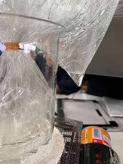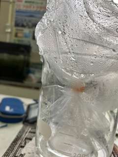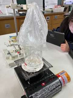 写真のように、水が沸騰してくるとポリエチレンの袋の中が、だんだん曇ってきました。そのあと袋の内側に水滴がついて、最後には袋の下の方に写真のように水が溜まっていることが確認できました。